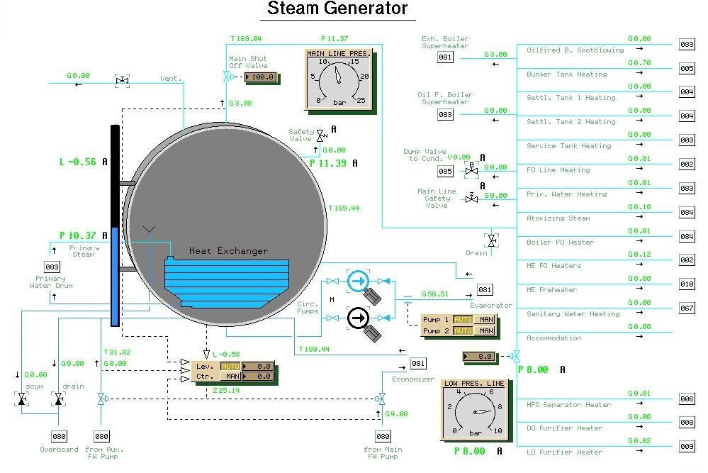 Ο λέβητας πετρελαίου (διπλής πίεσης) είναι εξοπλισμένος με δύο καυστήρες πετρελαίου με ψεκασμό μέσω ατμού (για νεφελοποίηση) και μπορεί να παράγει περίπου 50 t/h δευτερεύοντος ατμού στα 15 bar (217,5 lbs/sq") και στους 410°C (770°F). Ο πρωτεύων ατμός συμπυκνώνεται στο δευτερεύον τύμπανο (ατμογεννήτρια) και το συμπύκνωμα επιστρέφει στο πρωτεύον τύμπανο μέσω της βαρύτητας. Η πίεση του ατμού κυμαίνεται...