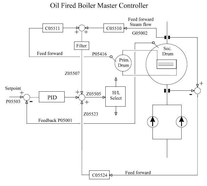 Ο κεντρικός ελεγκτής (master) παράγει ένα σήμα ενέργειας προς μια λογική μονάδα επιλογής “υψηλού/χαμηλού” (high/low select logic). Αυτή υπολογίζει τα setpoints για την επιθυμητή ροή πετρελαίου και αέρα στους δευτερεύοντες ελεγκτές. Ο κεντρικός ελεγκτής είναι τύπου PID με λειτουργία feed-forward από τη ροή ατμού στην έξοδο του τυμπάνου του δευτερεύοντος ατμού και (προαιρετικά) από την πίεση του πρωτεύοντος ατμού.